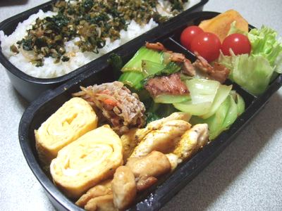 玉子焼き、キンピラゴボウ(冷)、鶏胸肉の焼いたもの(照り焼き味、カレー味の2種)