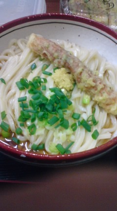 有名店「日の出製麺」の熱ぶっかけうどん3玉とちくわ天ぷらで350円也。安い。