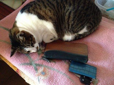 今日のにゃんこ写真は、長男の財布を横目に昼寝するきなこ
