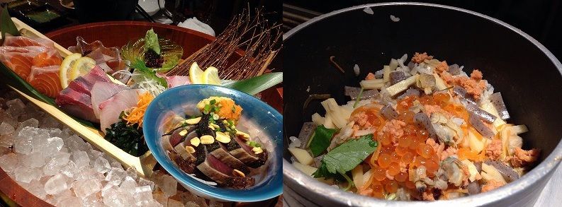 ◆お刺身5点盛り ◆ラム肉の炙り焼き ◆焼き鳥2品  (ささみのワサビ添え、つくね)