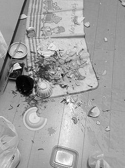 お盆が見事ひっくり返り、すべてが床の上に・・・
