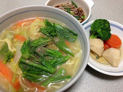スパゲティと悩んだけど、ちゃんぽん麺にしました。これにも菜の花が入っています。