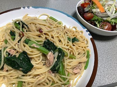 家庭菜園で採れた小松菜を使った「小松菜とツナのパスタ」です。