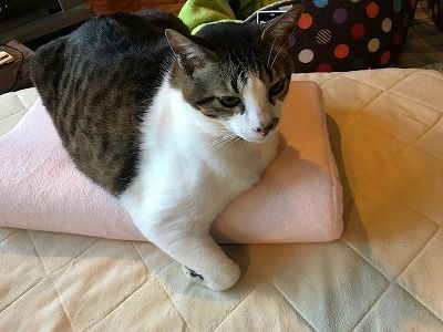 お母さんの枕の上でくつろぐきなこ。朝イチ、奥さんが布団から出た時はここにポジショニング