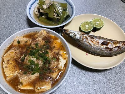 晩御飯は、麻婆豆腐がメイン。でも、実際に美味しかったのはカマスの干物