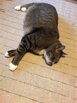 下が温かいので丸くならずに伸びています。ボーっとうつろな表情が幸せそう。