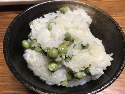 シーズン初の豆ごはん。今年初めて家庭菜園で栽培したウスイエンドウ豆の豆ごはんです。