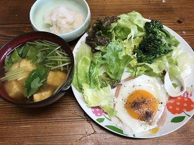 遅めの朝ごはんは、目玉焼きと菜園の野菜中心
