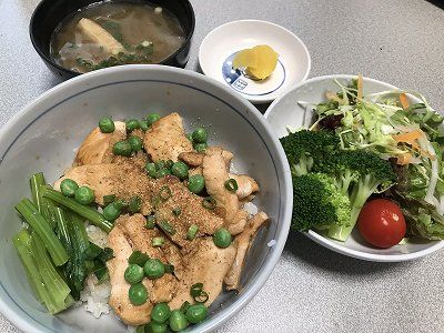 小松菜のお浸しを添えて、すいえんどうを散らしました。