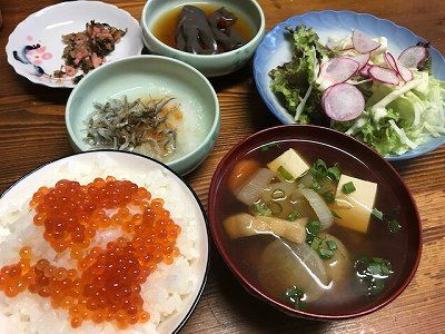 メインは、正月用に買っておいたイクラ。表面を食べ終わったら、追加で乗せました。