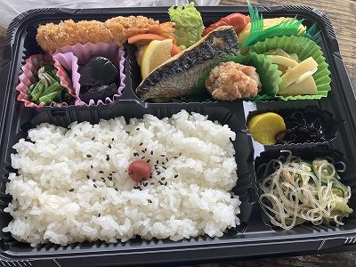お昼ご飯は、道の駅やすの農産物直売所で弁当。600円也