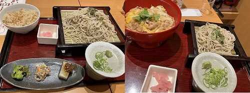 かやくご飯とざる蕎麦のセット。親子丼とざる蕎麦のセット