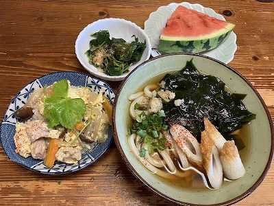 翌日の昼ご飯もミニ親子丼。冷たいぶっかけうどん