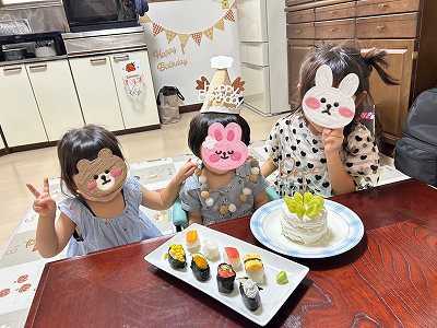 ヨーグルトケーキと偽寿司を囲んで、孫1,2,3で記念撮影
