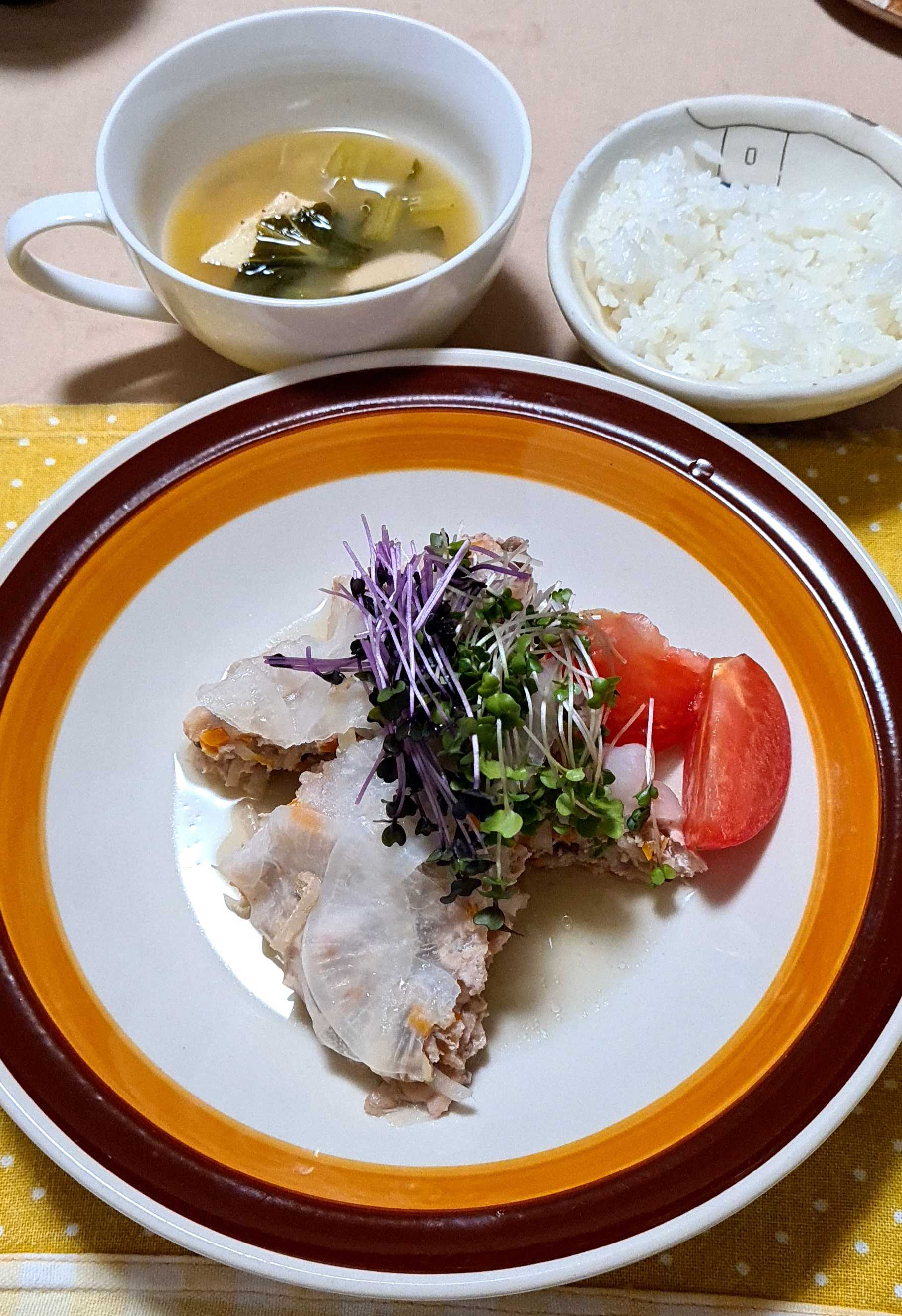 (2人分)豚肉薄切り 120gカボチャ 1/4個ズッキーニ 1本めんつゆ 大1.5バター 5g酒 少々1.カボチャは適当に切り分けておく2.ズッキーニは輪切り3.鍋にカボチャとズッキーニを入れ、上に豚肉をのせたら酒をふり、蓋をして蒸し焼きに4.全ての材料に火が通ったらバターとめんつゆを全体にからめる