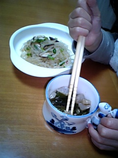 焼きそばみたく炒めてみました。小さい器のは茎わかめとこんにゃく煮。こんにゃくばっかり(^_^;)