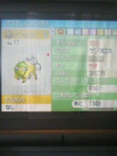 ホントひっさびさのポケモンネタです~。ゲームするのも久しぶりなんですけどねポケトレで色違いのポケモンを探してみたくなって昨日起動しました。ポケトレで色違いを探すには連鎖をすると確立が上がると攻略サイトで見ていたのですが、連鎖って何???って感じでした。で、昨日ポケトレを使って草むらを歩いてポケモンを倒したら、また草むらが揺れて…。なるほど~これが連鎖ってやつなのね、ってやっと分かりましたでも色違いなんて確立が8000分の1なんで滅多に出ないだろうなぁ~と思っていました。確かにすぐには出てきませんでしたけどね色々と場所を変えてポケトレを使っていたら、209番道路だったかな?でついに出ました!!!サイトだと草むらが光る、と書いてあったのですが初めて光る草むらを見た時は、これか~って思いましたね。ポケトレで揺れるのと全然違いましたよ。出てきたのは色違いのケンタロスでしたもちろん、即クイックボールで速攻GETです、レベル17なのでもちろん成功♪ケンタロスはポケトレ連鎖2回か3回で出ました。初めてのポケトレでの色違いGETなので、めちゃめちゃ嬉しかったです~息子は色違いケンタロスを見て「うわっ、色が気持ち悪い。」ですってでも色違いは色違いこれでしばらく色違いのポケモンを探そうかな、と思っています。が、やっぱり中々現れませんね、ホント昨日のはラッキーでした。