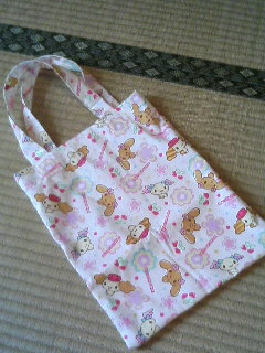 子供達も今日から本格的に授業が始まり、ホッとしています。が…昨日学校からのプリントで、娘の音楽の手提げを持ってくるように、って書いてあって息子の時は作ったので、じゃあ今回も作らないと…と言う事で作る羽目になりました。。。。。今日は布地を見に出かけましたが、コレッ!って言う布に出会わなくって結局家にあるシナモエンジェルズの生地で作ることにしました。これで作るにはちょっと生地が足りないかな?って感じだったのですが、作ると何とか教科書と笛が入りました。笛は若干バッグからはみ出しますが、まぁ~いっか。。。。。と言う事で出来上がったのが画像のものです~。 ただ、ベビーロックミシンがぶっ壊れてしまったので、ロックがかけれなくって(涙)ほつれないようにする為、内側に切れ端を折ってほつれないように補強しました。適当に裁断して適当に縫ったのでよくよく見ると、ちゃんと長方形か~?って感じに仕上がっています。まあ、音楽室に行くまで手提げで歩くだけなんでよしとしようか(爆)
