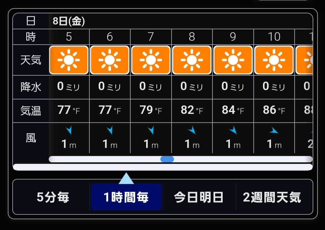 朝ウェザーニュース今日の天気検索したらなぜか上下に2つあって、下の方がこれ気温がヤバイ、上のは28から35位やからこれは偽サイトか?やばくない?ええと良く見ると何か違う。これは華氏?らしい無知やな
