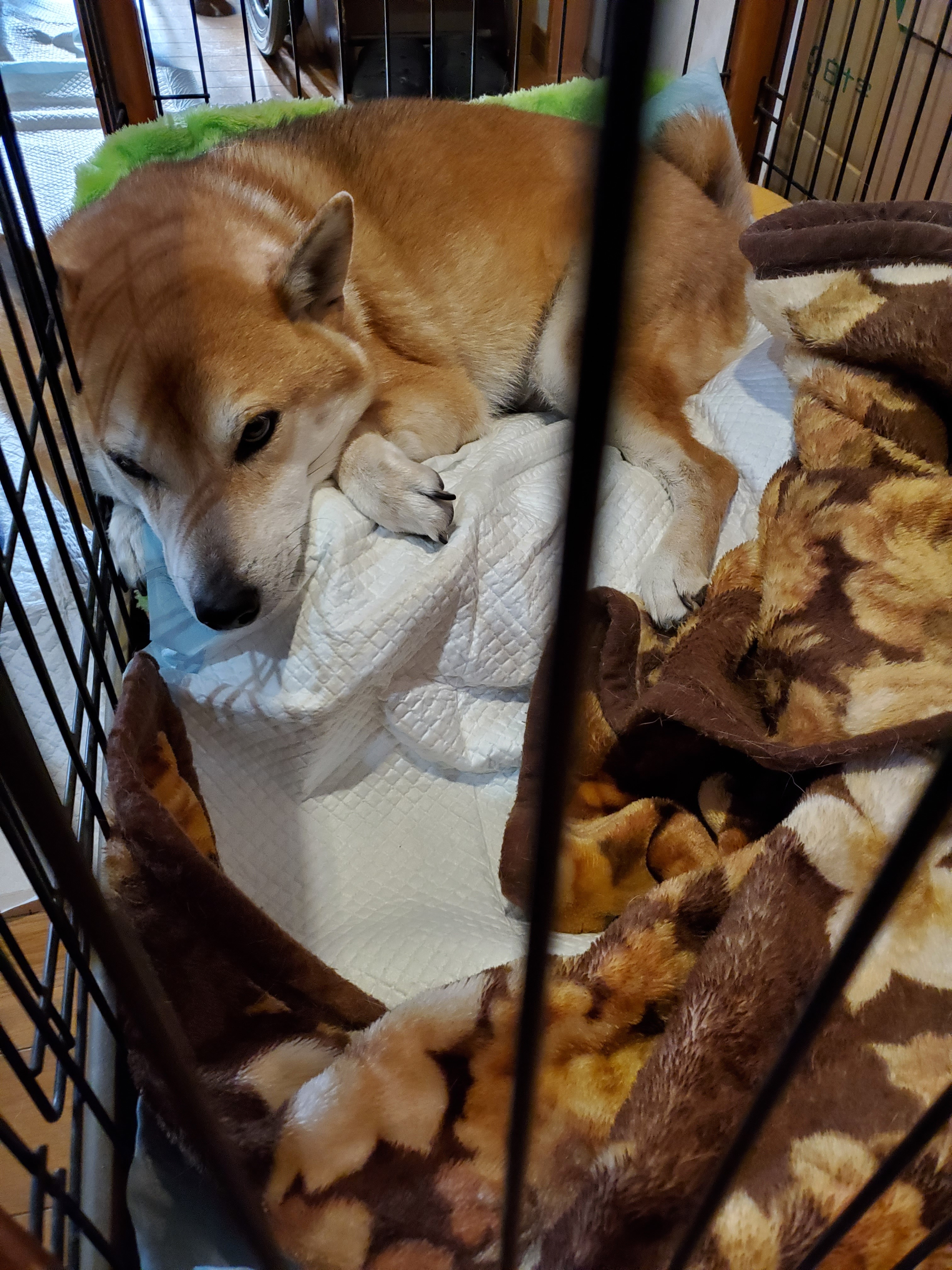 腸から出血下痢、後ろ足もたてず、もう長くないと言われた。なんか病院にいって、皮膚病の治療しなければ、もう少し長生きできたように思う。悔しい。受診前に名古屋獣医師会のテレフォンドクターにアドバイスももらったが、やれることは注射、輸血、造血剤位と言われた。無料で相談にのってもらえて、感謝しかない。ステロイド注射と下痢止め注射をうってもらって、もう見取りしかない。眠っています。