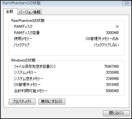 せっかくメモリを追加したのに利用できない領域があるのはもったいないのでRamPhantom 3を購入した。ダウンロード販売で2480円だ。さっそくインストールしてドライブレターをXにしてRAMディスクをOS管理外メモリのみにしてディスク容量をとりあえず2000MBにした。インターネット一時ファイルもここにセットしてみた。あとバックアップはしないにした。一時ファイルとして使うつもりただからバックアップは不要かなと。再起動・・・・時間がかかったけど無事に立ち上がった。これでしばらく様子を見てみよう。