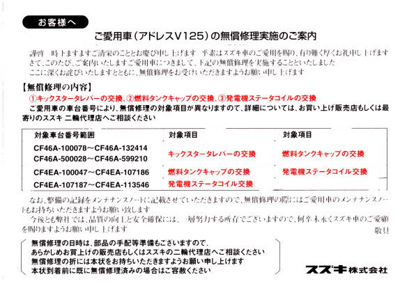 今朝アドレスV125GがSGに寄りかかって止まってた。キズは大丈夫か・・・・アドレスV125Gの。SGはもうすぐバイバイ。強風のときのアドレスV125Gの止める場所を考えないとマズイなぁ。孫がいないと静かだ。退屈だなぁ。仕事でもしてくるか。