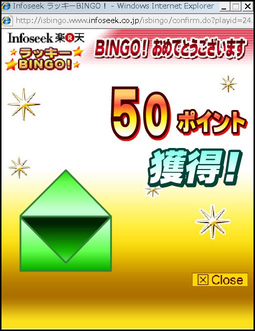 初めてビンゴしたA,B,Cと出てきてBを選択したら50ポイントだった。残念。だけど初ビンゴなのでちょっとうれしい小市民。