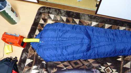 することないなぁと思ってたけど、いい案が浮かんだ。寝袋を布団乾燥機で蒸す。こういうものってダニとかいるかもしれない、いやいるね。ということで布団乾燥機で熱風注いで退治してやるぞと。はじめはマミー型だけで始めたが、封筒型の中にいれてやったほうが熱が逃げなくて更に効果が増しそうと思ったのでそうしてみた。みるみる熱風で膨らんできた。ダニさん、逝っちゃって~。10分もしないうちに部屋が暑くなってきた。窓あけると小雨だし、明日やれば良かったと思ったけど、もう始めてしまったのでやるっきゃない。