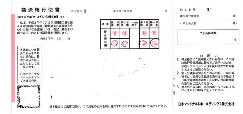 株主優待が来た~と思ったら議決権行使書だったがっかりだ。あの女社長がのこのこと出てきて被害者ぶったりするから更にイメージ悪くしてどんどん顧客離れ。さっさとゴメンナサイとすればいいのに。オイラはぜ~んぶ「否」で出しておくオイラがこんなものを送ったところで何の影響もないけど。