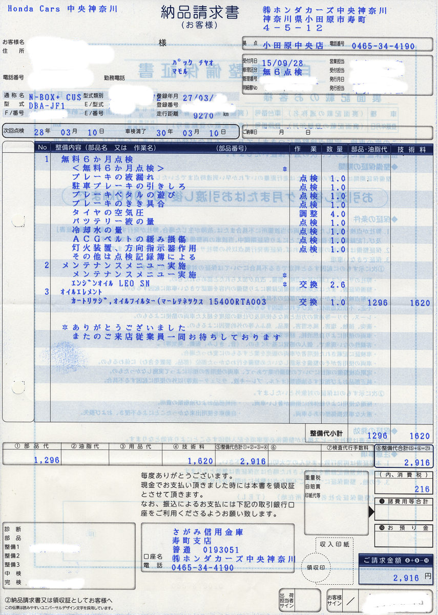 早いもので6カ月経過した。距離は9270キロ。以前にも疑問に思ってるオイル交換がなんとも・・・・。でもまぁ有料だけど支払ってエレメントも交換してきた。本当はタイヤローテーションもしたかったのだがこれまた有料ということで(6カ月点検はタイヤ関係は目視点検だけで、ホイル外して点検しない)やめた。あと3か月でホイル付きでスタッドレスタイヤを購入する予定。3年後、まかせチャオが切れたらオイル関係はイエローハットでいいかな。工賃は無料だから。点検はHonda Cars 中央神奈川小田原中央店さんで