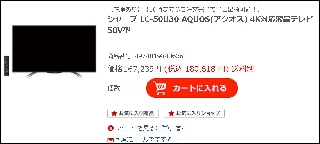 電話があった。5年前に買ってあげたソニーの40インチのテレビが壊れたと。あれま、早くネ?同時に買った我が家はなんでもない。音は出るけど映像が出ないらしい。ブルーレイにしても音だけ、BSも音だけ。あらら、逝っちまったね。買い換えな~、どうせなら4Kだね。3Dは結局流行らないからあってもなくてもOK。4Kの型落ち買えば安くていいんじゃね?もうテレビの進化はやることがなくて目先の変化だけで売ろうしている感じだし。何買っても一緒だよ。4Kの型落ちでどうせなら55とか60インチにしちゃいなよ~。40インチでいいという、あれま、もったいない。あとで奥さんに、オイラに電話してきたってことは買ってほしいというおねだりのサインじゃないかな?と言ったら甘やかしたらダメと厳しいお言葉そうかなぁ、テレビぐらいいいんじゃね?孫も見ることだし、居間のテレビはデカいのがいいな。40インチなんて買うなよ~。夜になって奥さんがやっぱり買ってあげようかな~と言い出したやっぱりね、そうくると思ってたよ。そうなると予想して探しておいた。シャープのAQUOS LC-50U30 [50インチ]でいいかなと。楽天だとこれでいいんじゃないのとなった。型落ちで50インチで4Kだ。さっそく長女へ連絡。するとヤマダに行って注文してきたんだけど帰宅して壊れたテレビのコンセント抜いてしばらくして繋いだら映ったんでヤマダはキャンセルしたんだと。あれま~、リセットみたいなものかな。直って良かったね、ほんじゃあ買わないよんちなみにヤマダに注文してキャンセルしたテレビは55インチで4Kじゃないやつで15万ぐらいだったと。4Kじゃないと安いよ~だって。次はとりあえず4Kにしておけよ~。
