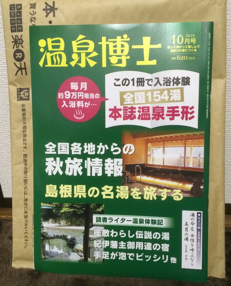 う~ん、買わなくてもいいかなと思ったけど奥さんのポイントだけで買えるから買っとくか。ポイント失効したらもったいないし。【楽天ブックスならいつでも送料無料】温泉博士 2015年 10月号 [雑誌]