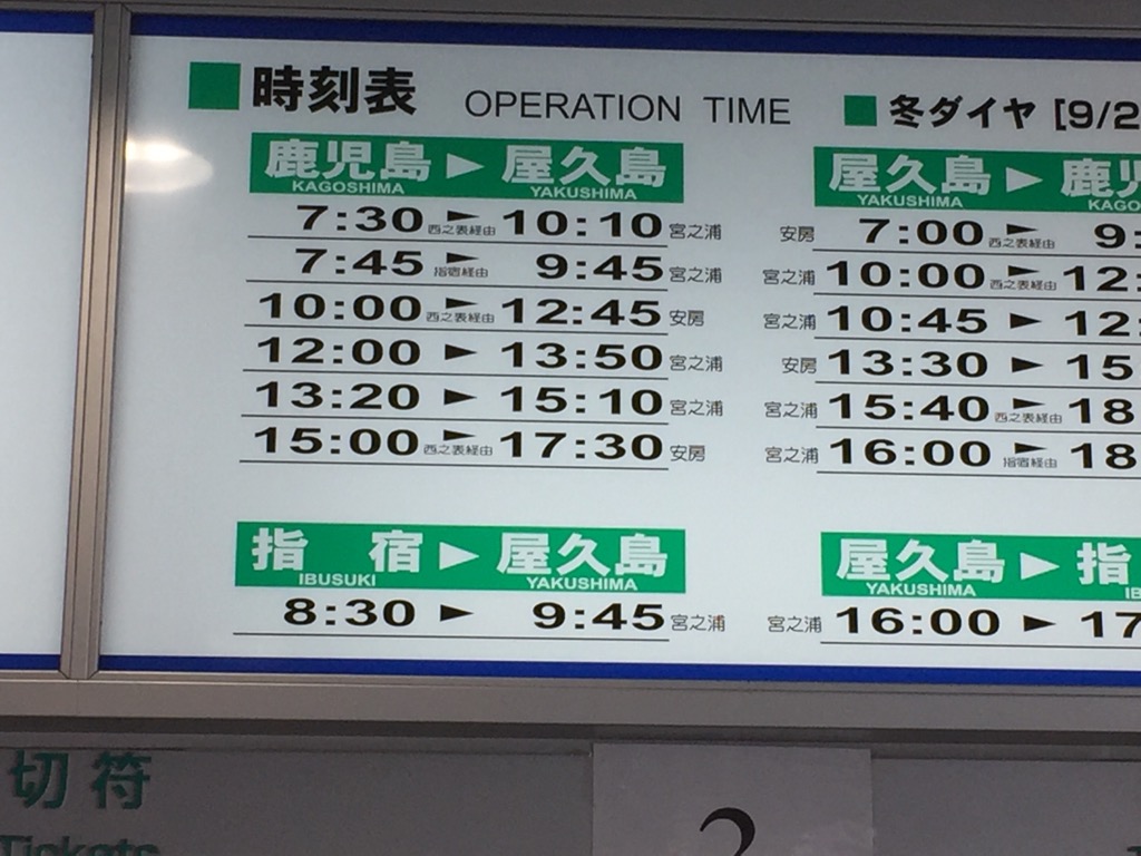 屋久島行きの船が台風の影響で欠航だと高速船は出るらしい。差額は7000円らしい。どうなるやら。行くの?行かないの?行ったけど帰れるの?何だか面白くなって来たぞ?オイラ的にはすぐに帰れなくなってもいいなそういうのがあってもいいな。取り敢えず答えが出るまで部屋で寝てよう。フロントに預けた鍵を返してもらってテレビ見てる。奥さんは朝ドラが見られると喜んでいる。8時半までやる事ないや。行ける事になった。高速船に変更だ。差額が発生するが阪急交通社が負担してくれると。7000円ぐらいかかるらしい。ありがたいね〜。10時の船らしい。ほぼ満席らしい。何とか切符は取れたらしい。公平を期す為に席はクジ引きとなった。奥さんが選んだのは、真ん中の席ダァ〜。満席ダァ〜。種子島経由の屋久島行きダァ〜。奥さんの晴れ女パワーが炸裂した。バスの移動中は雨でも降りて歩くときは雨が全く降らない。宿に向かうバスに乗ると雨が降る。助かるねぇ。写真はいっぱいあるけど面倒なのでおしまい
