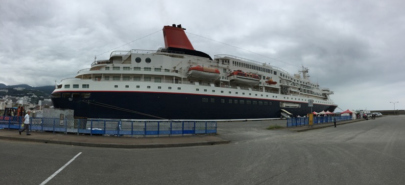 飛鳥の次に大きいのかな?いつの間にか来ていた。この後は岩手に行くらしい。夕方出港していった。デカイなぁ。