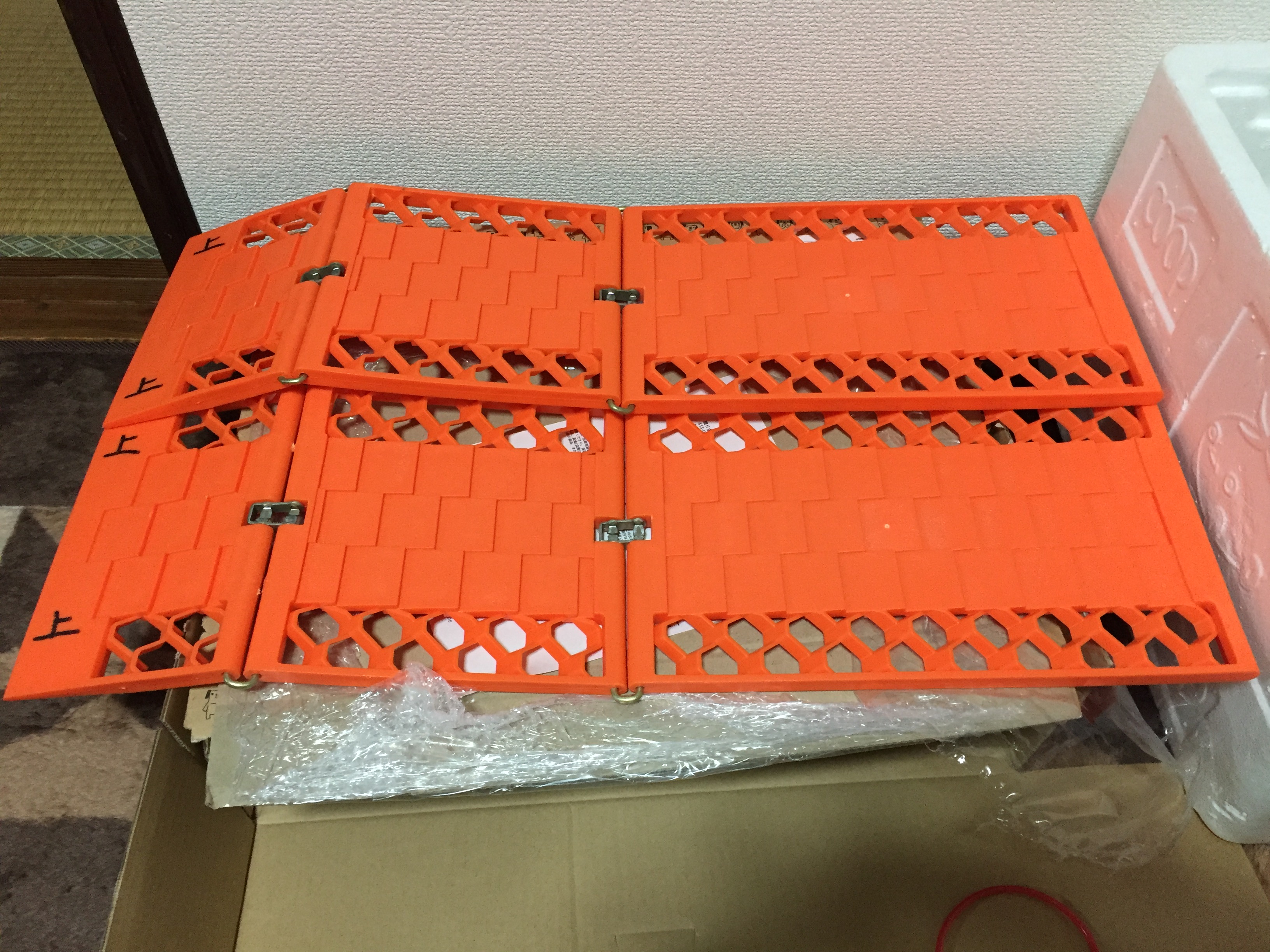 SGに乗ってるときはスコップ積んで走ってた。燃費しか取り柄のない車の時はスタッドレスタイヤのみ。NBOX+カスタムはスタッドレスタイヤとこれで雪道を走る。こんなの使いたくないけど4WDじゃないから念のためだ。安かったけど大丈夫かな。暗いときに上下がわからないと困るから上と書いた
