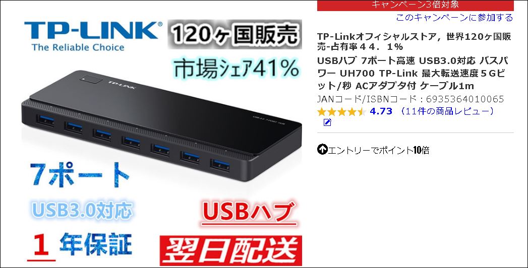 届いた。3.0の7ポートだ。USBハブって2.0と混在させると遅いほうに合わせてしまうらしいがそれでもいいや。2.0の4ポートを2個使っているが最近調子が悪くて繋げたものが認識されなくなったりするようになった。差し直すとOKだがそんなの面倒。この際なので3.0にした。将来は2.0は無くなってしまえばいいけどどうなのかな?これで3.0のハブが3+7で10ポートになった。3.0のものは外付けHDDが2台だけかな、投資にあってないやこれで少しだけどすっきりした。繋げてみて認識されなくなったものはなし。新品だし当たり前か。買ってから気づいたんだけど接点復活材をシューしたら治っちゃったりして・・・・マイッカ(^^)/USBハブ 7ポート高速 USB3.0対応 バスパワー UH700 TP-Link 最大転送速度5Gビット/秒 ACアダプタ付 ケーブル1m(6935364010065) 価格 3,590(円) × 1(個) = 3,590(円)小計 3,590(円)消費税 0(円)送料(税込) 0(円)手数料(税込) 0(円)ポイント利用 - 353(円)