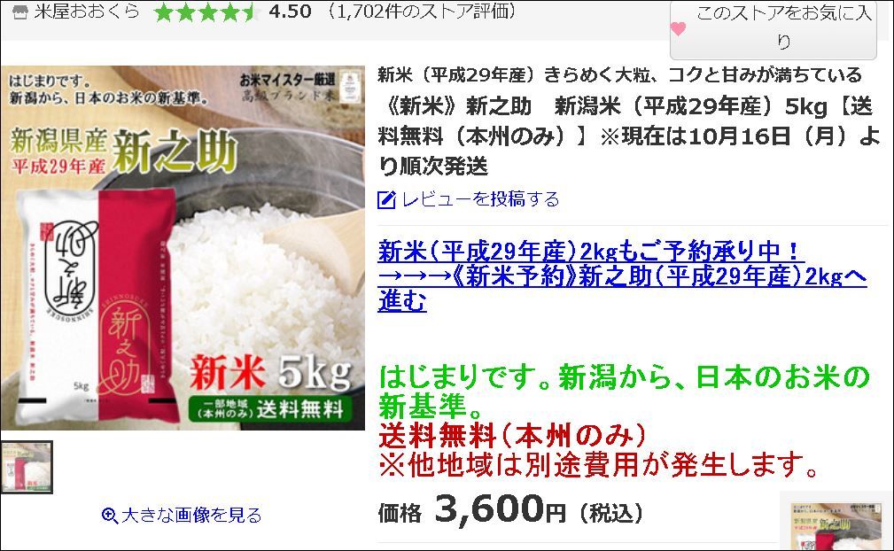 18日で失効するポイントが2836ポイント。もったいないから何かを買おう。とは言っても今欲しいものが思いつかない。で、お米にした。無難だな。新米(平成29年産)きらめく大粒、コクと甘みが満ちている《新米》新之助 新潟米(平成29年産)5kg【送料無料(本州のみ)】※現在は10月16日(月)より順次発送新之助だって、新種かな?マイッカ、楽しみだ。新米》新之助 新潟米(平成29年産)5kg【送料無料(本州のみ)】※現在は10月16日(月)より順次発送3,600円×1=3,600円発送目安:3営業日前後商品の合計金額 : 3,600円送料:0円ポイント利用分:2,836ポイント合計金額 :764円通常ポイント:180ポイント期間固定ポイント Yahoo!プレミアム会員限定!Tポイント5倍!:144ポイント ソフトバンクなら ポイント+5倍キャンペーン:180ポイント Yahoo! JAPANカードご利用で毎日Tポイント3倍:36ポイント 5のつく日[アプリ利用で最大+4倍]:144ポイント合計獲得予定ポイント:684ポイントポイント使って764円の支払い、しかしポイントが684ポイント付くからタダみたいなもんか。ポイント失効が速いから無駄に買い物させられているなぁ
