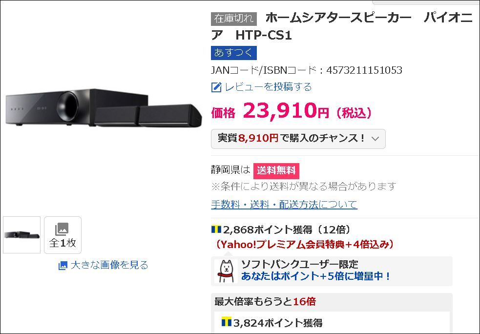 居間のテレビ、REGZA 55Z700Xの音をもう少し良くしたいのでスピーカーを検討していたがパイオニアのHTP-CS1にした。テレビ台のスペースとテレビの足の構造がサウンドバーだと干渉してしまうのでHTP-CS1にした。これなら無問題だと思う。ストア名:ア-チホ-ルセ-ル注文ID :archholesale-********注文日時:2017年11月25日 20時51分16秒支払方法:クレジットカード決済商品情報ホームシアタースピーカー パイオニア HTP-CS1送料区分:送料無料-同梱不可23,910円×1=23,910円商品の合計金額 : 23,910円送料:0円ポイント利用分:170ポイント合計金額 :23,740円通常ポイント:239ポイント期間固定ポイント Yahoo!プレミアム会員限定!ポイント5倍!:956ポイント ソフトバンクなら ポイント+5倍キャンペーン:1195ポイント Yahoo! JAPANカードご利用で毎日ポイント3倍:239ポイント 5のつく日[アプリ利用で最大+4倍]:956ポイント合計獲得予定ポイント:3585ポイント最後の1個を買ったので在庫が0になったみたい。