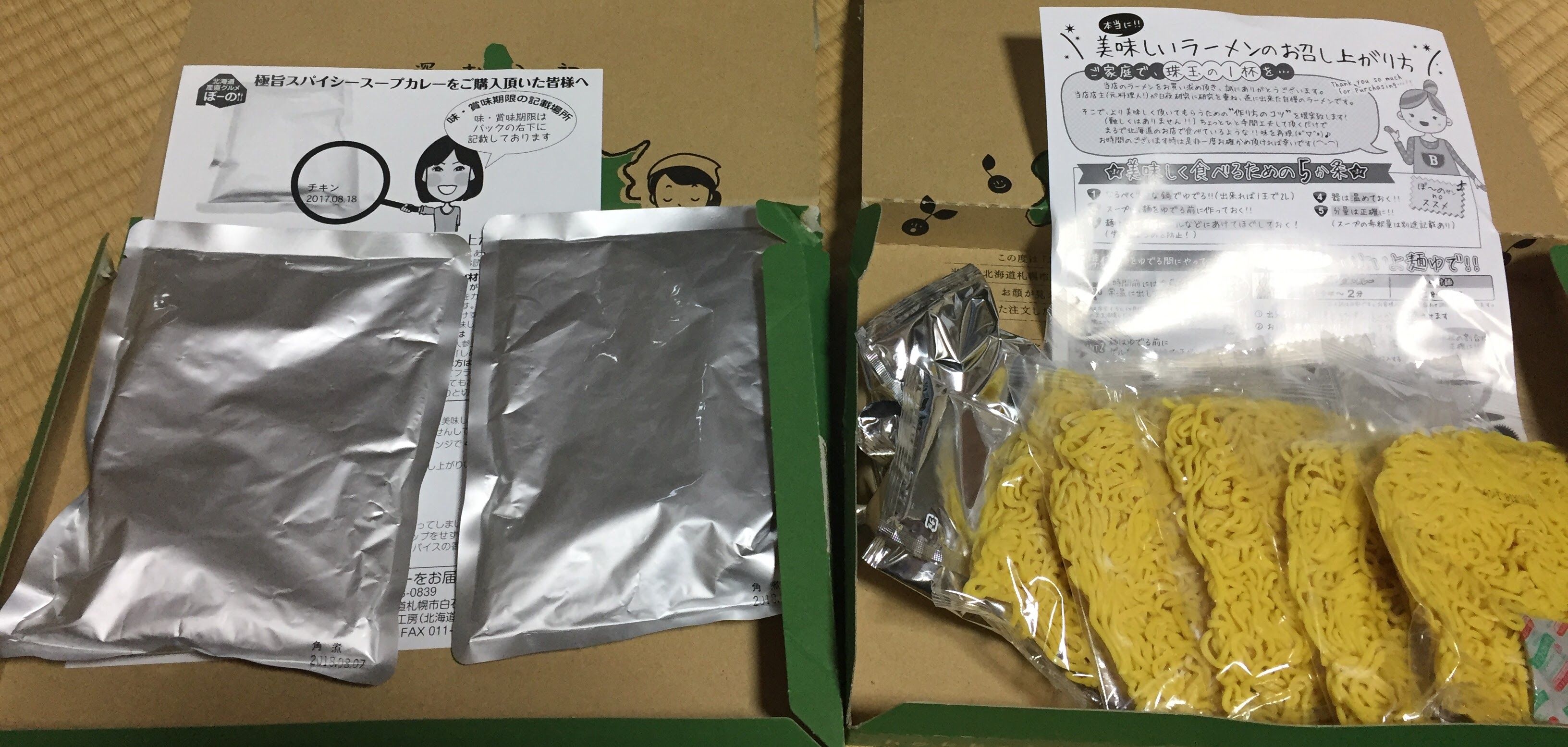ポイント消化で注文しておいたものが今頃届いた。届ける日とかは指定できないからしょうがない。(1)5のつく日は断然お得!(送料無料)3種から選べる北海道.スープカレー2食. レトルトカレー ポイント消化 ご当地グルメ 1000円 ポッキリ 訳あり セール【B】組み合わせ:角煮×角煮★お買い物レビューに:ご協力お願い致します♪★メール便代引きは追加送料200円:了解済みで注文する★メール便配送の為日時指定不可:了解済みで注文する649円×1=649円発送目安:配送の到着目安(出荷から最大4日)(2)5のつく日は断然お得!(送料無料)5種から選べる.北海道熟成ラーメン5食セット.お取り寄せ 詰め合わせ 1000円ポッキリ お試し ご当地ラーメン セール【G】味をお選び下さい1:醤油味をお選び下さい2:醤油味をお選び下さい3:味噌味をお選び下さい4:味噌味をお選び下さい5:塩★お買い物レビューに:ご協力お願い致します♪★メール便代引きは追加送料200円:了解済みで注文する★メール便配送の為日時指定不可:了解済みで注文する649円×1=649円発送目安:配送の到着目安(出荷から最大4日)商品の合計金額 : 1,298円送料:0円ポイント利用分:939ポイント合計金額 :359円通常ポイント:12ポイント期間固定ポイント Yahoo!プレミアム会員限定!ポイント5倍!:48ポイント ソフトバンクなら ポイント+5倍キャンペーン:60ポイント Yahoo! JAPANカードご利用で毎日ポイント3倍:12ポイント 5のつく日[アプリ利用で最大+4倍]:48ポイント合計獲得予定ポイント:180ポイントクーポン利用:あり(上記合計額は500円値引き済みです)