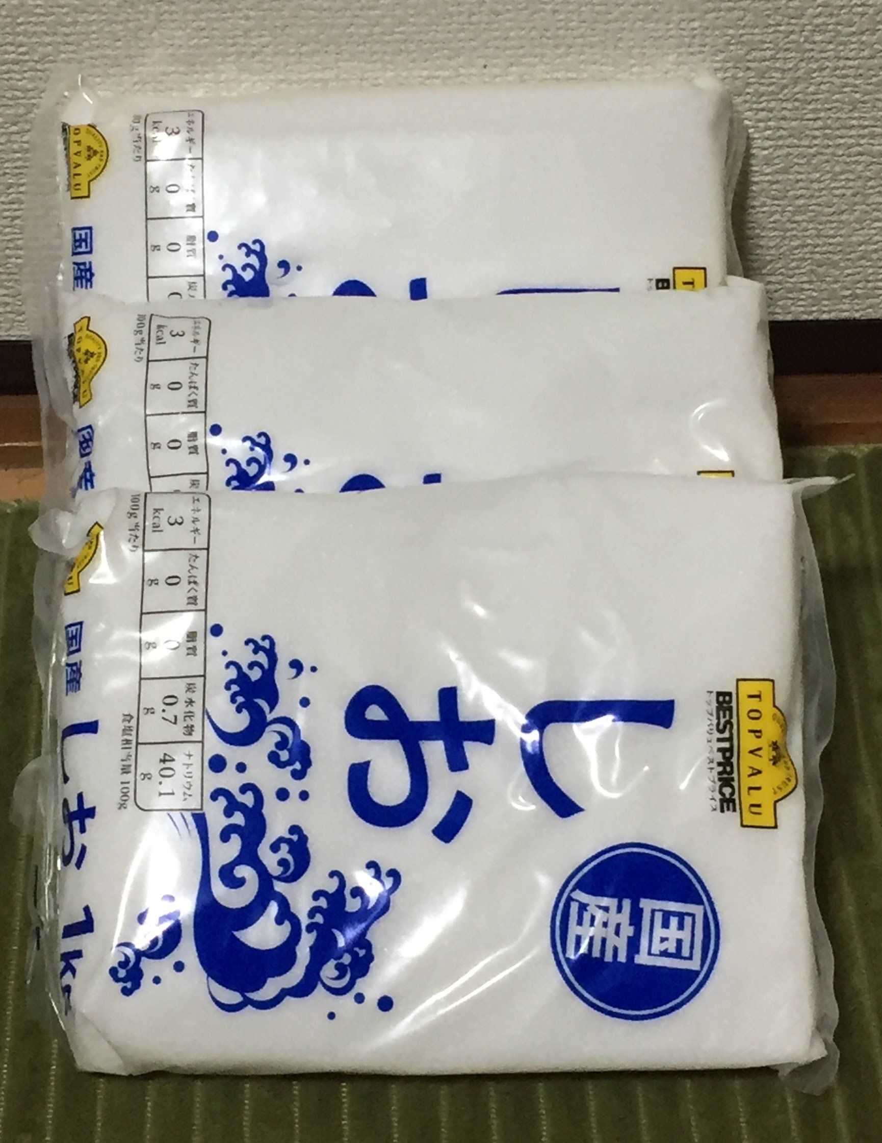 水槽の水を交換するときに180g×2で360g使っている。次回分が無いので3Kg買ってきた。これで8回は大丈夫。塩を入れる理由は金魚の体内塩分濃度が約0.6%くらいなのでそれに近づけるためだ。とはいえ0.6%にすることはせずに少し低く設定している。本当に具合が悪くなったら0.6%で塩浴させるつもりだ。180gだとだいたい0.38%ぐらいになるみたい。正確ではないが参考になる。0.6%にしようとしたらだいたい280g必要かな。塩なしで飼っているほうが普通かもしれないがオイラはないよりはマシということで180gにしている。