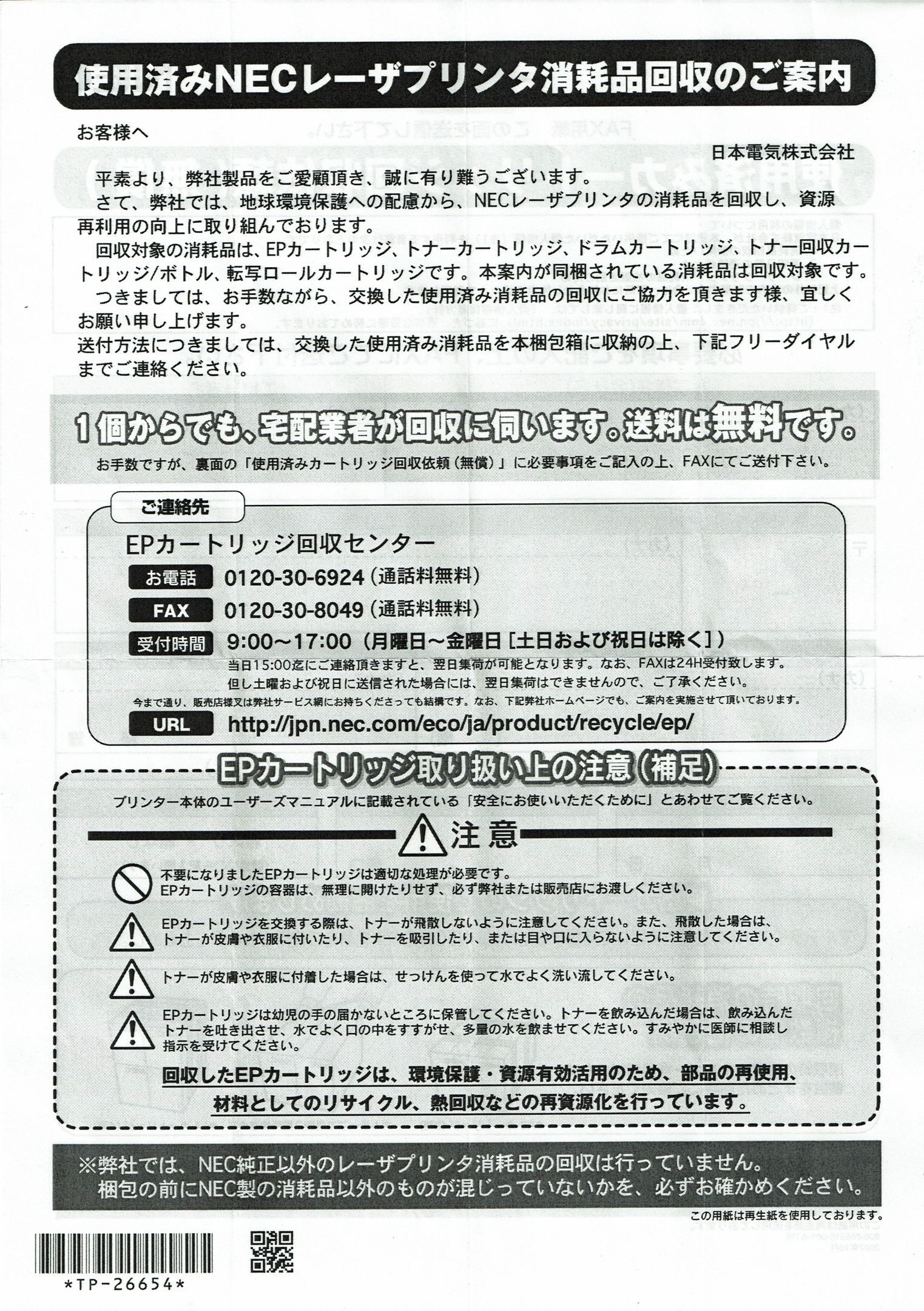 昨日交換したトナーの箱にリサイクルで無料引き取りしてくれるという用紙が入ってた。NEC偉い。ちゃんとリサイクルしてるんだ。しかも引き取りにも来てくれるらしい。後日、ちゃんと手続きしておこうと思う。うっかり捨てないで良かったよ~。