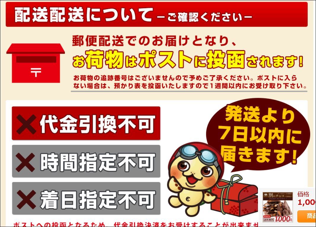 ポイント消化でポチッたチョコが10日以上経っても届かないのでショップに問い合わせしてみた。奥さんはポリフェノール摂取の為といってチョコをいろいろ買ってくる。オイラはもともとチョコ大好きなのでお試しでポチッてみた。美味かったらポイント消化でこれからも注文しようと思っている。ぼくの玉手箱屋注文日時:2017年11月11日 14時32分31秒支払方法:クレジットカード決済1)訳あり スイーツ ケーキ 割れチョコ スイート ごろごろアーモンド 300g 訳あり クーベルチュール使用 送料無料 (スイーツ ケーキ) 1000円ぽっきり SALE※郵便配送につき:代金引換・日時指定はできません。※お届け方法:ポスト投函となります。※商品到着の目安:当店より出荷後7日以内に到着します。889円×1=889円商品の合計金額 : 889円送料:0円ポイント利用分:397ポイント合計金額 :492円通常ポイント:8ポイント期間固定ポイント Yahoo!プレミアム会員限定!ポイント5倍!:32ポイント ソフトバンクなら ポイント+5倍キャンペーン:40ポイント Yahoo! JAPANカードご利用で毎日ポイント3倍:8ポイント いい買物の日 Yahoo!プレミアム会員限定 2.9億商品がポイント11倍キャンペーン:48ポイント合計獲得予定ポイント:136ポイント届いてないよ~、なんでだ~。自動返信がきた。Yahoo!ショッピングストア「ぼくの玉手箱屋ー」に送信されました。ストアから連絡があるまでお待ちください。お問い合わせ内容注文番号bokunotamatebakoya-*********お問い合わせ内容(配送について)10日以上経ちますがまだ届きません、ご確認願います。 注文ID :bokunotamatebakoya-********注文日時:2017年11月11日 14時32分31秒 支払方法:クレジットカード決済