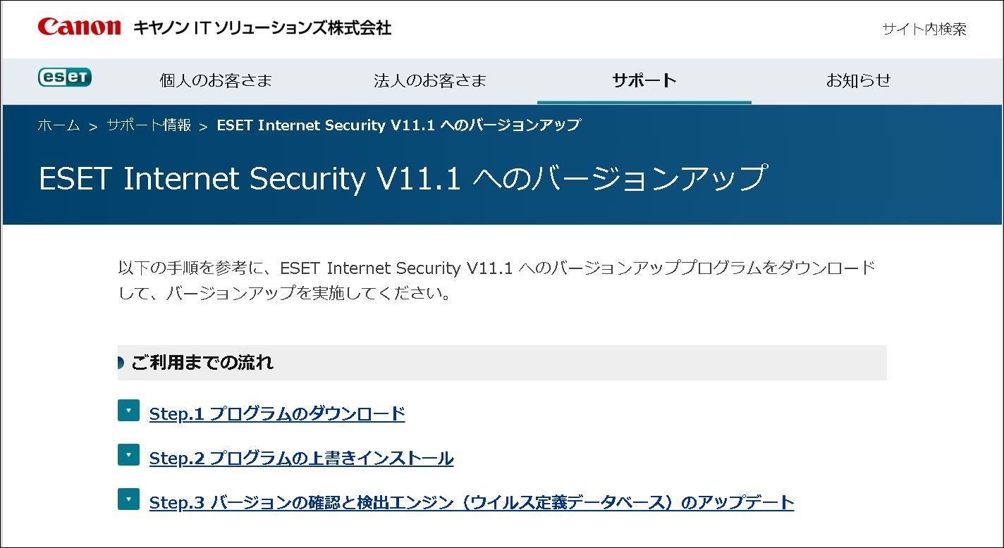 ■対応プログラム------------------------------2018年5月9日に公開した、以下のプログラムで対応を開始しました。・ESET Internet Security V11.1現在ESET製品をご利用中の環境に、Windows 10 April 2018 Update を適用される場合は、適用前に、プログラムのバージョンアップ(無償)が必要になります。プログラムのダウンロード、バージョンアップ手順は下記URLをご参照ください。【 http://ssml.canon-its.jp/c/aeuears8eGmOs2ab 】