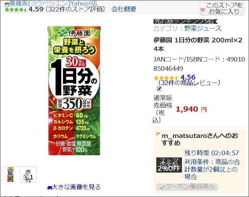奥さんのポイントは使い切った。オイラのを調べたら少しあるのでジュースで使い切ることにした。養鼈園(ヨウベツエン)Yahoo!店(1)伊藤園 1日分の野菜 200ml×24本1,940円×1=1,940円発送目安:2~4日以内に発送(休業日を除く)商品の合計金額 : 1,940円送料:0円ポイント利用分:1,546ポイント合計金額 :394円通常ポイント:19ポイント期間固定Tポイント Yahoo! JAPANカード会員特典:19ポイント Yahoo!プレミアム会員限定!ポイント5倍!:76ポイント 5のつく日[アプリ利用で最大+4倍]:76ポイント合計獲得予定ポイント:190ポイント養鼈園なんて聞いたことがないや。初注文だ。出かけるので6月8日以降に届くように注文した。オイラはいないが奥さんはたぶん戻っているハズだ。