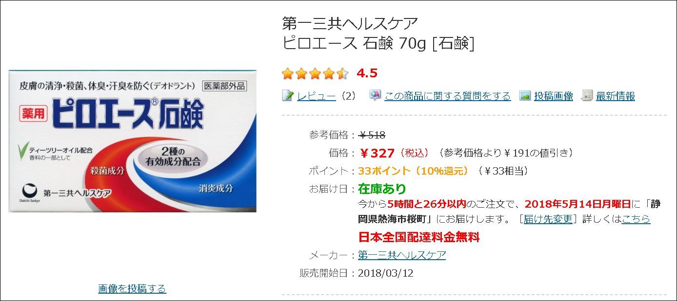 ヨドバシサンガ送料込みだとダントツに安いので買った。足はこれに限る。ピロエース 石鹸 70g [石鹸]」配達希望日:2018年05月14日 合計 2 点 654 円配達料金: 0 円他店は高いし(アマゾンも)ヤフーなんかも沢山買わないと送料が付く。ヨドバシさんは応援したいショップだ。テレビとかの家電製品も安かったら買うのだが、高いのはなぜか他店に負けてしまうことがあって買えないのが残念。