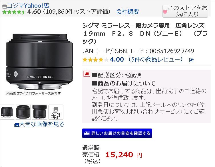 壊れたレンズは諦めてSONY α5000用にレンズを注文した。今度はいちどは使ってみたかった単焦点だ。30ミリと悩んだが広角が欲しいので19ミリにした。19mm F2.8 DN ブラック [ソニー用]はなかなか良さそう。今回からなるべく奥さんの名義で買おうと思う。スマホがソフトバンクなのでポイントがいい。オイラのはYmobileだコジマYahoo!店(1)シグマ ミラーレス一眼カメラ専用 広角レンズ 19mm F2.8 DN(ソニーE) (ブラック)414613515,240円×1=15,240円(2)ケンコー・トキナー 46mm MCプロテクター NEO 46MCプロテクターNEO18078421,130円×1=1,130円商品の合計金額 : 16,370円送料:0円ポイント利用分:381ポイント合計金額 :15,989円通常ポイント:1,304ポイント期間固定Tポイント Yahoo! JAPANカード会員特典:163ポイント Yahoo!プレミアム会員限定!ポイント5倍!:652ポイント ソフトバンクなら ポイント+5倍キャンペーン:815ポイント 5のつく日[アプリ利用で最大+4倍]:652ポイント合計獲得予定ポイント:3586ポイント九州に出かけるまでに届かないと困るぞ。