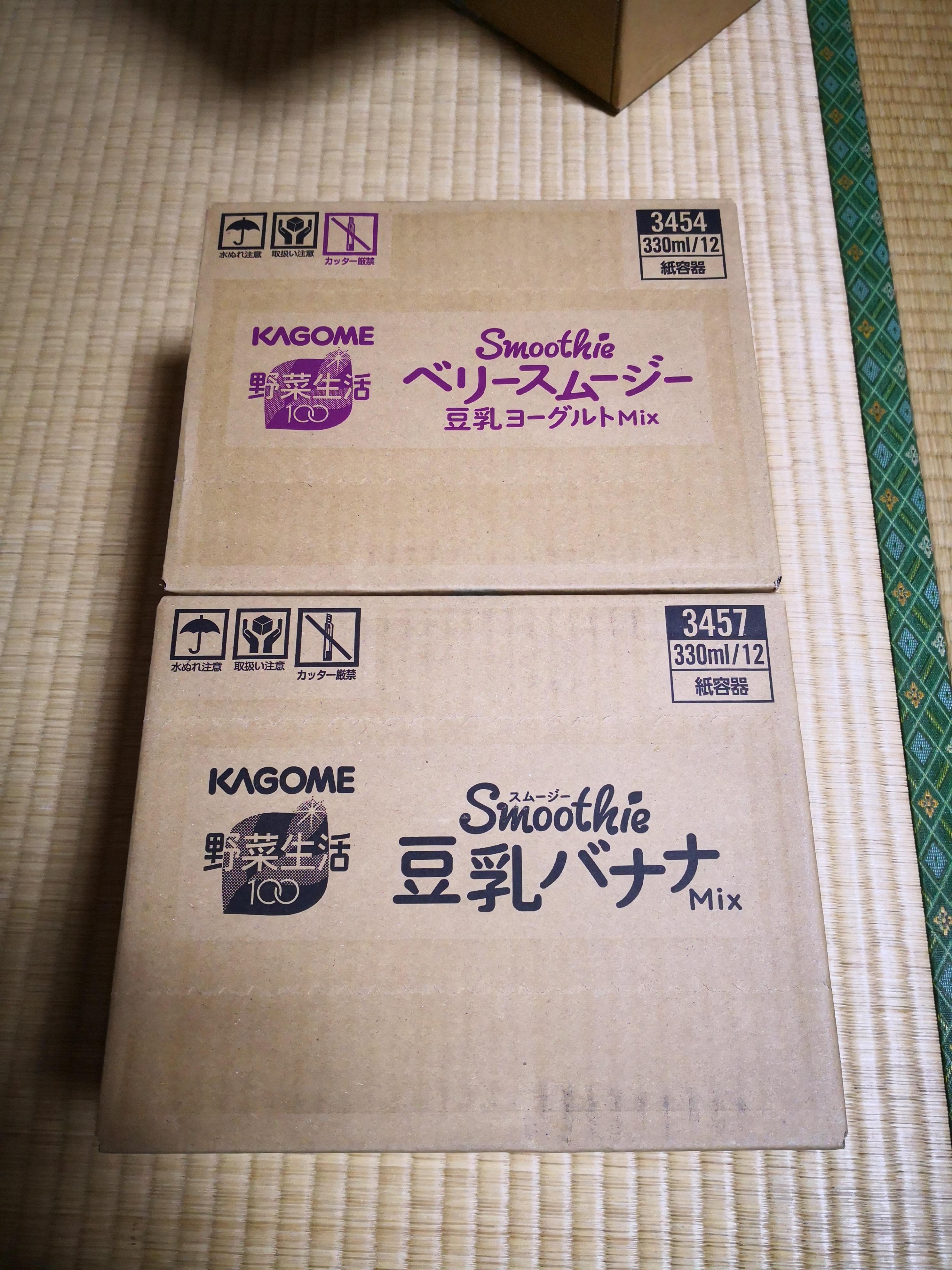 いつ注文したかも忘れてた。奥さんはスムージーが大好き。よく冷やして飲むと美味いぞ。ストア名:爽快ドリンク専門店注文ID :soukaidrink-10*****注文日時:2018年05月15日 02時49分14秒支払方法:クレジットカード決済お届け希望日:2018年05月26日(1)カゴメ 野菜生活100スムージー 330ml×12本 4種類から選べる【送料無料(北海道、沖縄を除く)】商品:ベリースムージー豆乳ヨーグルト発送可能時期:3日-7日(通常)2,040円×1=2,040円発送目安:3~7日以内に発送(休業日を除く)(2)カゴメ 野菜生活100スムージー 330ml×12本 4種類から選べる【送料無料(北海道、沖縄を除く)】商品:豆乳バナナ発送可能時期:3日-7日(通常)1,540円×1=1,540円発送目安:3~7日以内に発送(休業日を除く)商品の合計金額 : 3,580円送料:0円ポイント利用分:1,080ポイント合計金額 :2,500円通常ポイント:35ポイント期間固定Tポイント Yahoo! JAPANカード会員特典:35ポイント Yahoo!プレミアム会員限定!ポイント5倍!:140ポイント 5のつく日[アプリ利用で最大+4倍]:140ポイント合計獲得予定ポイント:350ポイントクーポン利用:あり(上記合計額は500円値引き済みです)