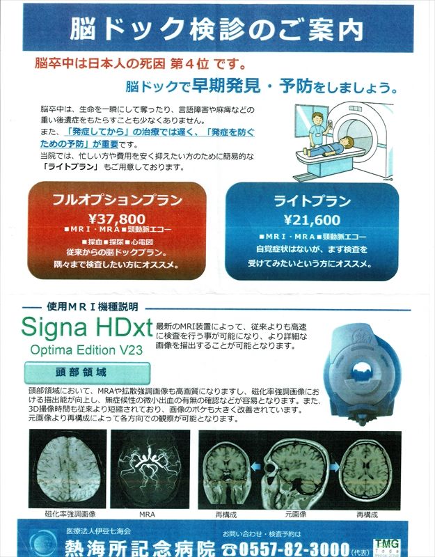お客さんと話をしていると脳梗塞等で半身不随になったとかいう人の話を聞く。60前の人もいるしオイラと変わらない年齢の人もいる。1回ぐらいは見てもらったほうがいいかな?ということで診てもらってきた。いつもかかっている先生に相談したら血液検査なんかはいつも調べているんだから不要。今回はライトプランで充分でしょと言われライトプランにした。脳を輪切りに診てもらったあとは首の動脈を超音波かな?診てもらう。そして診断だ。まずは奥さんから。脳の血管は至って正常、特に細くなっているところもない。年相応の動脈硬化はあるかな。少し白く映っている部分があるけどまぁ大丈夫でしょう。少し蓄膿があるみたい、これはあったということかな、気にするほどではない。先生との会話をあとで聞き返せるようにスマホで録音しておいたので確認したら 蓄膿のなごりがありますね だった。で、オイラ。脳の血管にちょっとだけ細いところがある。角度を変えて見せてもらうとたしかにちょっぴりある。脳はどこにも白いところはないから心配なし。ご主人のほうが左側に蓄膿が見られる、奥さんより大きい。ひぇ~、たしかに白く映っている部分が奥さんより大きい。過去のものかもしれないから気にしなくてもいいです。先生との会話をあとで聞き返せるようにスマホで録音しておいたので確認したら 蓄膿のなごりがありますね だった。動脈硬化も奥さんよりちょっと・・・。油っこいものは摂取を減らしたほうがいいですね。ラーメン大好きなんだけど~。それは控えたほうがいいですね。あれま、じゃあこれからは蕎麦にするか肉を減らして野菜や魚を増やしましょう、肉は油の少ない物を。ロースよりヒレか、ロース好きなんだけどな~。血圧が高いなら気を付けたほうがいいですね。オイラはむしろ低いんですけど~。普段飲んでいる薬をみてもらうが問題なし。2人で43200円、ヤフーカードでお支払い。まぁ、安心?ちょっと不安?知らないまま生活するよりはいいか。ラーメン、必ずスープは残そう・・・って蕎麦を食えってか