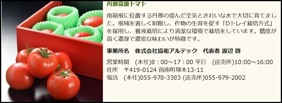 奥さんとランチに出かけた。寿司屋の前に立ち寄っていく。知り合いが株式会社 協和アルテックのトマトがすごく甘くておいしいと聞いてたので寄っていく。ここはアルミダイキャストの工場かな?よく知らないけど(^-^;ここで生産しているトマトは丹那高原トマトとしてなかなか有名らしい。よく見ると工場の奥にハウス栽培しているところが見える。ここで生産しているのはホントみたい。プチトマト以外もあるらしいけど自販機ではこれしか売ってなかった。工場に入って聞けば教えてくれたのかな?500円の自販機があるので買っていく。奥さんは待ちきれずに消毒のウエスで拭いて(一応ね)食べだした。あま~い、おいしいよ って。オイラも1個食べてみる。おおっ、甘いね、美味いね。こんな近くにこんなおいしいトマト作ってて売ってるなんて知らなかったよ。遊びに行くときにちょっと寄れる場所なのでいいかも。