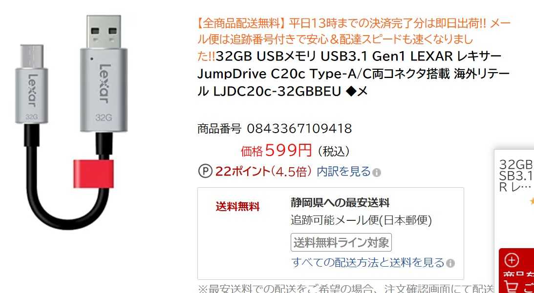 放浪してて32Gのメモリが行方不明になってた多分NBOX+カスタムの中にあると思うが探し疲れたえ~い、買うかということでポチッておいたのが届いたなんとC端子が付いててスマホでも使えそう(知らんけど)NBOX+カスタムに使えるのは当然としてスマホでも使えるのかな?万一のときは写真や動画データの避難先として使えたらいいな(まぁ、これから先もそんなことは起きないと思うけど)まずはHUAWEI Mate 10 Proに刺してみた使えるようにしますか?みたいな表示が出たのでハイすると勝手にフォルダまで作られて開いたお~、使えるじゃん後発のRakuten BIGも当然使えるべ使えた今や当たり前なんだろうなオイラが知らなかっただけだ32GB USBメモリ USB3.1 Gen1 LEXAR レキサー JumpDrive C20c Type-A/C両コネクタ搭載 海外リテール LJDC20c-32GBBEU 価格 \599 x 2 = \1,198 ■■■風見鶏で使える100円OFFクーポン■■■クーポンコード:AH6M-URBU-5RT4-SHV3 クーポン原資:ショップ[1] クーポン有効期限:2021/07/04 クーポン対象楽天商品価格 -\100 x 1 = -\100小計 1,098 (円)合計 1,098 (円)